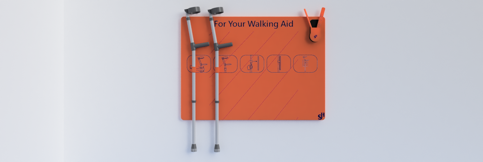 We created a magnetic board, and a stainless steel slappy band. The Slappy Band would grab onto the walking aid and then easily attach to the board through magnetism. Both the board and the slappy band would be covered in polyurethane in order to create a better grip.